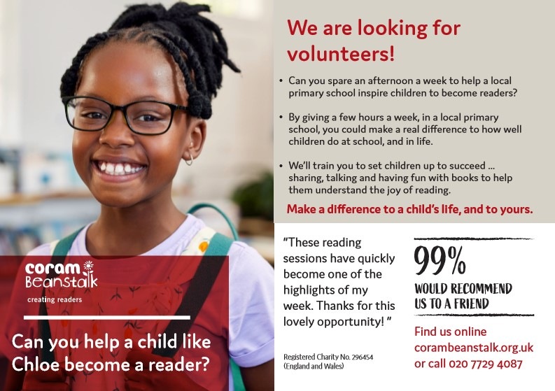 We are currently recruiting volunteer Reading Helpers for primary schools in the Wigan area, and we’re reaching out to local, community-minded businesses to ask for your support in spreading the word. Having volunteers from the local community makes a huge difference to children’s confidence and progress with reading. Even a small amount of promotion can help us reach people who may not otherwise hear about the opportunity. I wondered if you might be willing to help by: Displaying our electronic flyer in your premises, and/or Sharing our volunteer opportunity on your social media channels or newsletter If you do share us online, I’d love it if you could let me know so I can see where we’re reaching people locally. If you would prefer, I can also arrange to post printed copies of our flyer. About the volunteer role What our Reading Helpers do: Support primary-aged children with their reading Commit around one afternoon per week during term time Receive full training, DBS checks, and ongoing support from Coram Beanstalk Volunteers don’t need teaching experience, just time, patience, and a love of reading. If you’d like more information, please feel free to get in touch or visit our website: https://www.beanstalkcharity.org.uk/ Thank you very much for your time and for supporting children in the Wigan community. Kind regards, Helen Goodwin Support Representative | Coram Beanstalk ? Direct number: 07581 150 615 ? Working hours: Tuesday, Wednesday & Thursday, 9am–5pm